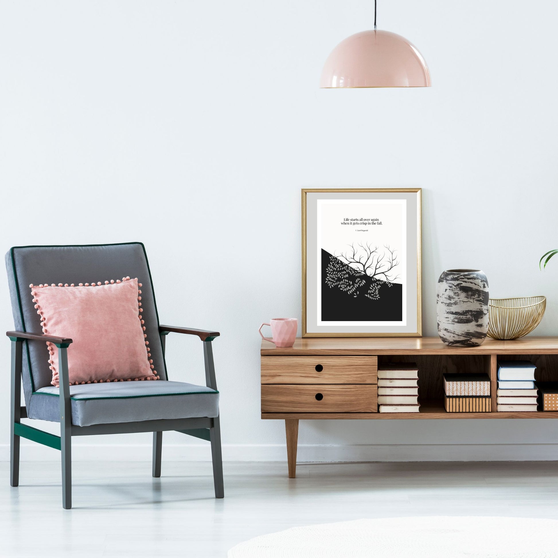Welcome the season of renewal with our F. Scott Fitzgerald Quote Print – 'Life starts all over again when it gets crisp in the fall.' This beautifully minimalist tree-themed wall art poster from Ink Frame Studio celebrates fresh starts and the beauty of change.