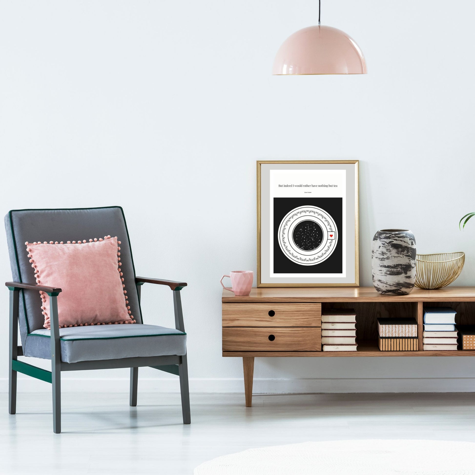 Crafted on premium matte paper, it features a cosmic teacup illustration adorned with delicate Victorian patterns. Available in multiple sizes, it makes an ideal gift for Austen fans, tea drinkers, or slow living enthusiasts.