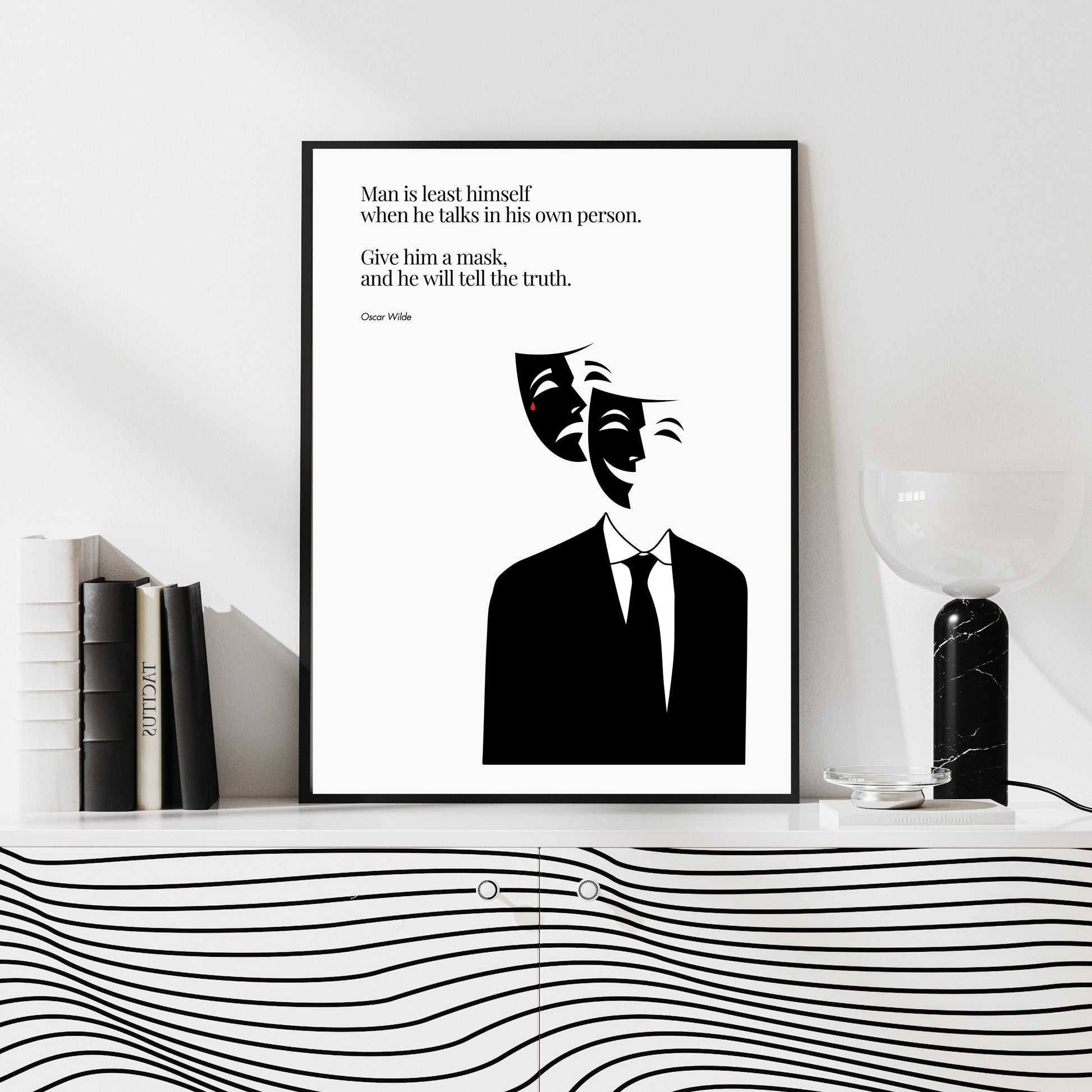 This minimalist poster visualizes one of Oscar Wilde's most piercing reflections on human nature: 'Truth wears many faces. Sometimes, it hides behind a smile.' The design features two theatrical masks—one laughing, one weeping—hovering over a faceless figure, exploring the duality of identity and the honesty found in disguise.