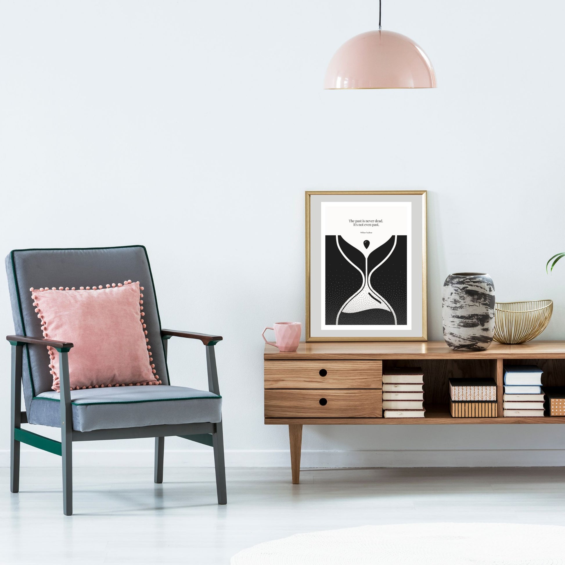 Discover the essence of literary wisdom with the William Faulkner Quote Poster. Featuring the thought-provoking quote, “The past is never dead. It’s not even past,” this minimalist wall art is beautifully illustrated with a symbolic black and white hourglass.